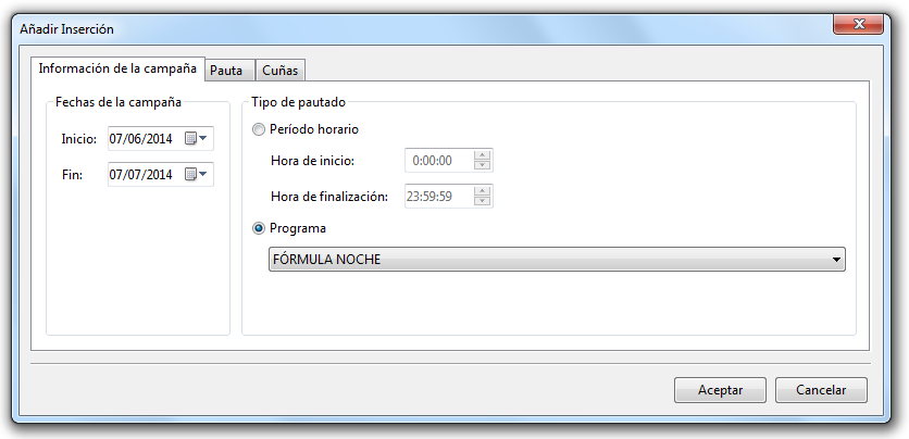- Permite definir los programas o los rangos horarios en los que se radiarán las cuñas.